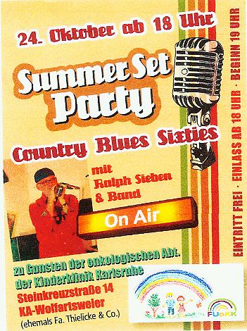 Klänge von John Denver, Johnny Cash, B ob Dylan und Buddy Holly, frenetisch jubelnde Konzertbesucher und als Highlight die Einfahrt von zwei Harleys, begleitet von der Rockerhymne "Beinhart" - all das fand nicht irgendwo im Homeland des Country Blues statt, sondern in Wolfartsweier. Für die Organisation dieses Benefizkonzerts zeichneten das Ehepaar Elisabeth und Ralph Sieben- Grohmann verantwortlich. Letzterer hat als Gitarrist und Sänger mit der Band "On Air" dieses zweite Benefizkonzert organisiert. Mit dabei waren Sascha SIEBEN (Baß), Mike KIES (Gitarre) Richard MUNGENAST (Keyboard) und die Drummer Rolf und Jörg MATERN, der als Profi- Schlagzeuger bereits mit Bands wie AcDc oder METALLICS auf der Bühne stand.170 begeisterte Besucher erlebten von ihm ein 20 minütiges Schlagzeugsolo und waren damit zurück in den '"Golden Sixties".