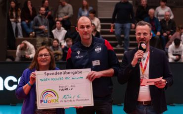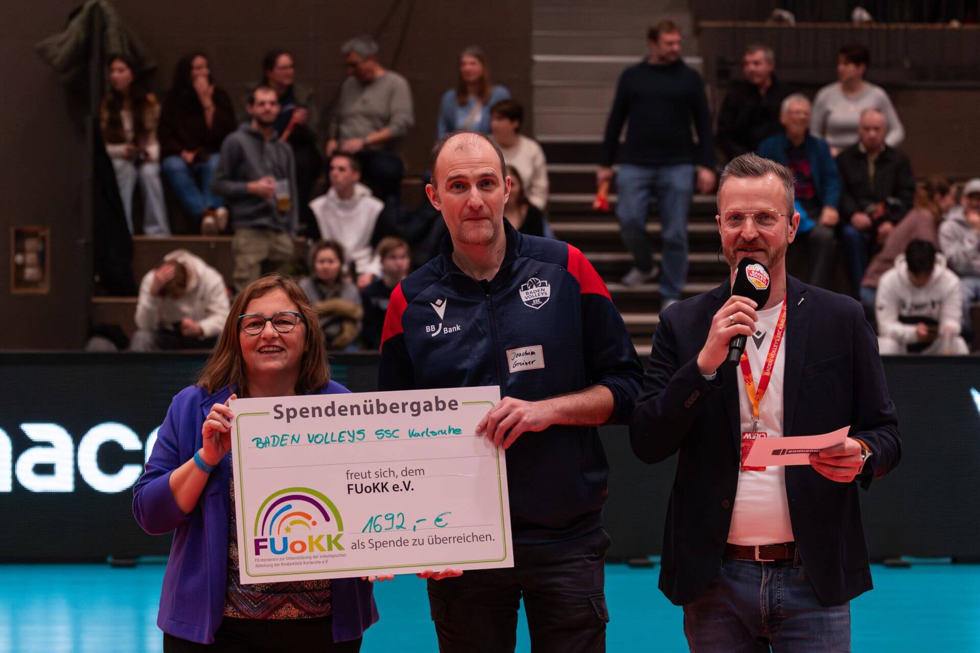 Wo sonst gepritscht, gebaggert und geschmettert wird, fand am 25. Januar eine Spendenübergabe an die FUoKK-Vorsitzende Admira Knoll statt. Schauplatz des karitativen Geschehens war die Lina-Radke-Halle in der Karlsruher Steinhäuserstraße, wo Volleyball-Erstligist BADEN VOLLEYS seine Heimspiele ausrichtet. Im Rahmen der Partie gegen die Volley GOATS Mitteldeutschland überreichte BADEN-VOLLEYS-Abteilungsleiter Joachim Greiner der FUoKK-Vertreterin einen auf 1.692 Euro ausgestellten Scheck.