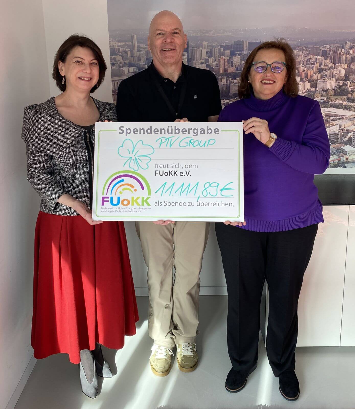 Die PTV Group hat ihren während der Corona-Pandemie eingerichteten Sozialfonds aufgelöst und den Gesamtbetrag von über 33.000 Euro an drei wohltätige Organisationen gespendet. Nun erhielten die Hanne Landgraf Stiftung, Fuokk und der Karlsruher Kindertisch jeweils 11.111,89 Euro. Die symbolische Übergabe fand am 12. November in den Räumlichkeiten der PTV Group statt. Alle Empfänger zeigten sich tief dankbar für die großzügige Unterstützung, welche sowohl die Geschäftsleitung als auch die Mitarbeitenden der PTV Group möglich gemacht haben.