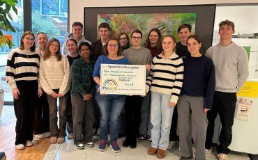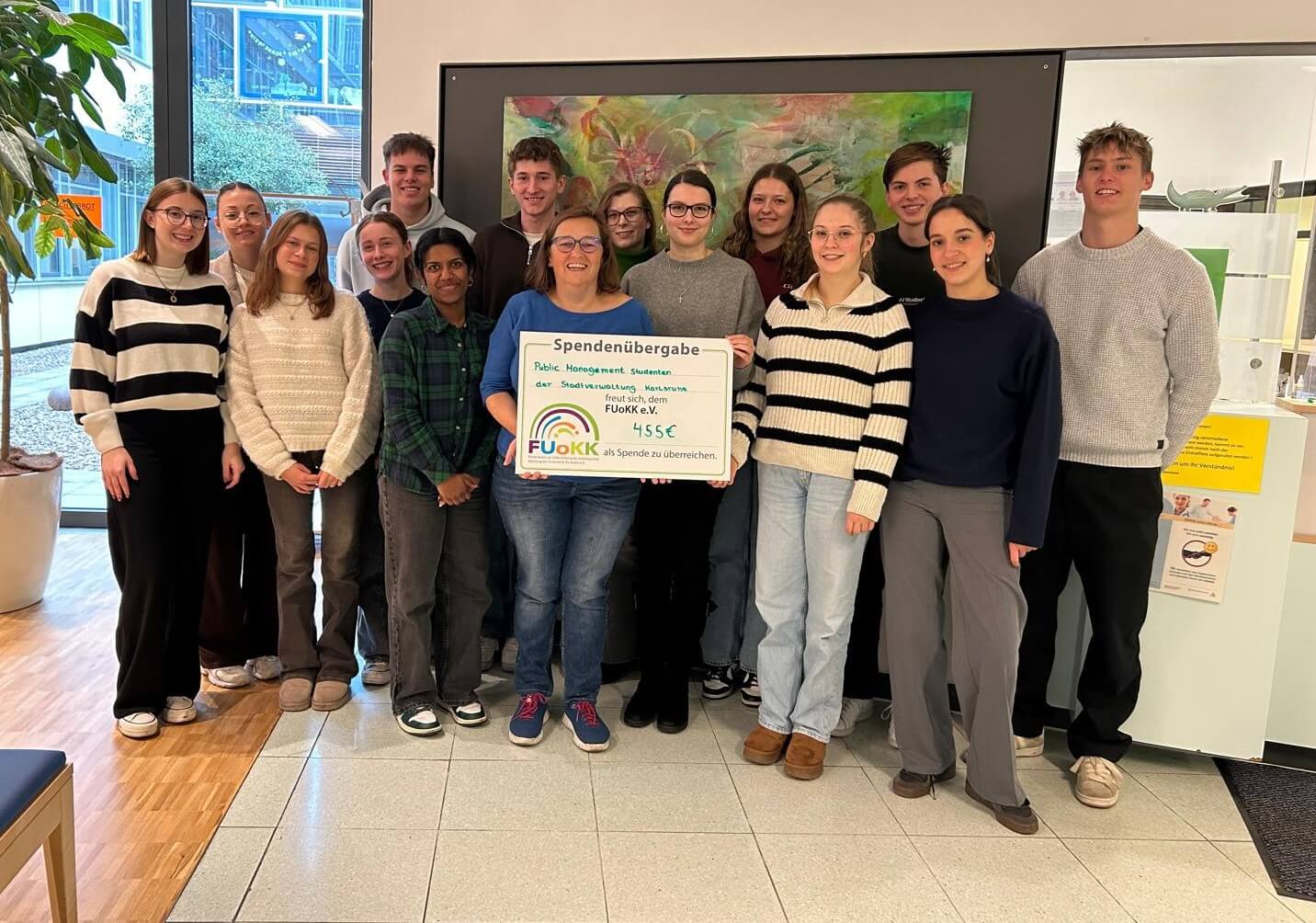 Das duale Studium „Public Management“, das von der Stadt Karlsruhe angeboten wird, verbindet Theorie und praktische Arbeit und vermittelt Kenntnisse und Methoden, die man zur Arbeit in Bereichen wie beispielsweise Personalwesen, Finanz-, Sozial-, Jugend- und Ordnungswesen benötigt. Dass die jungen Menschen sich nicht nur in ihrem Tätigkeitsbereich auskennen, sondern auch über eine ganze Menge Empathie und Herz verfügen, bewiesen sie im Rahmen eines Projekts in der Vorweihnachtszeit, als sie in einem Altersheim gemeinsam mit den dortigen Bewohnern gebastelt, gesungen und gebacken haben. Der Vorschlag, den Rest des davon verbliebenen Budgets in Höhe von 455 Euro an den FUoKK zu spenden, kam von Studentin Kim Merkel.